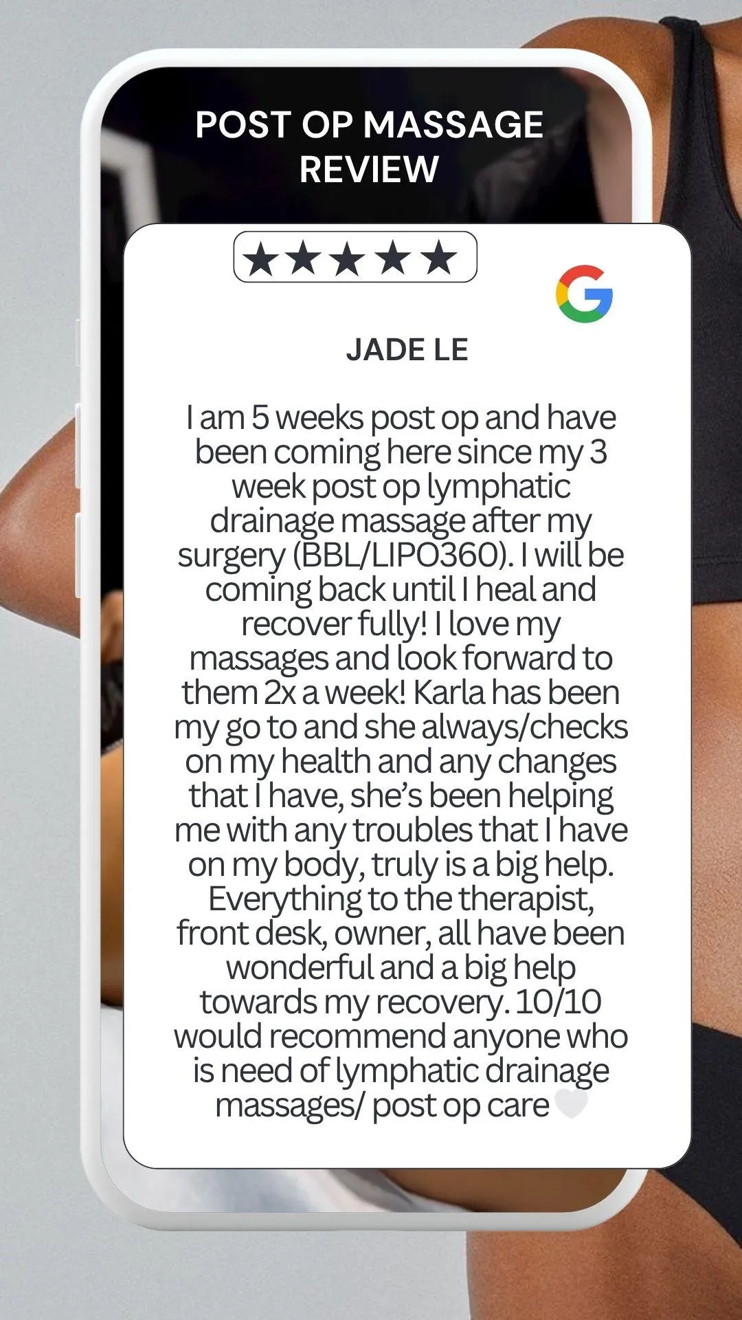 To get the best results, lymphatic massages are encouraged 24 hours after your surgical procedure while the incisions are still open, and the drains are intact, it is important to use this time wisely and begin your massages. (Please consult with your surgeon for specific instructions on when to begin postop massages, each surgeon has his/her preference and each recommendation will be on a case to case basis.)