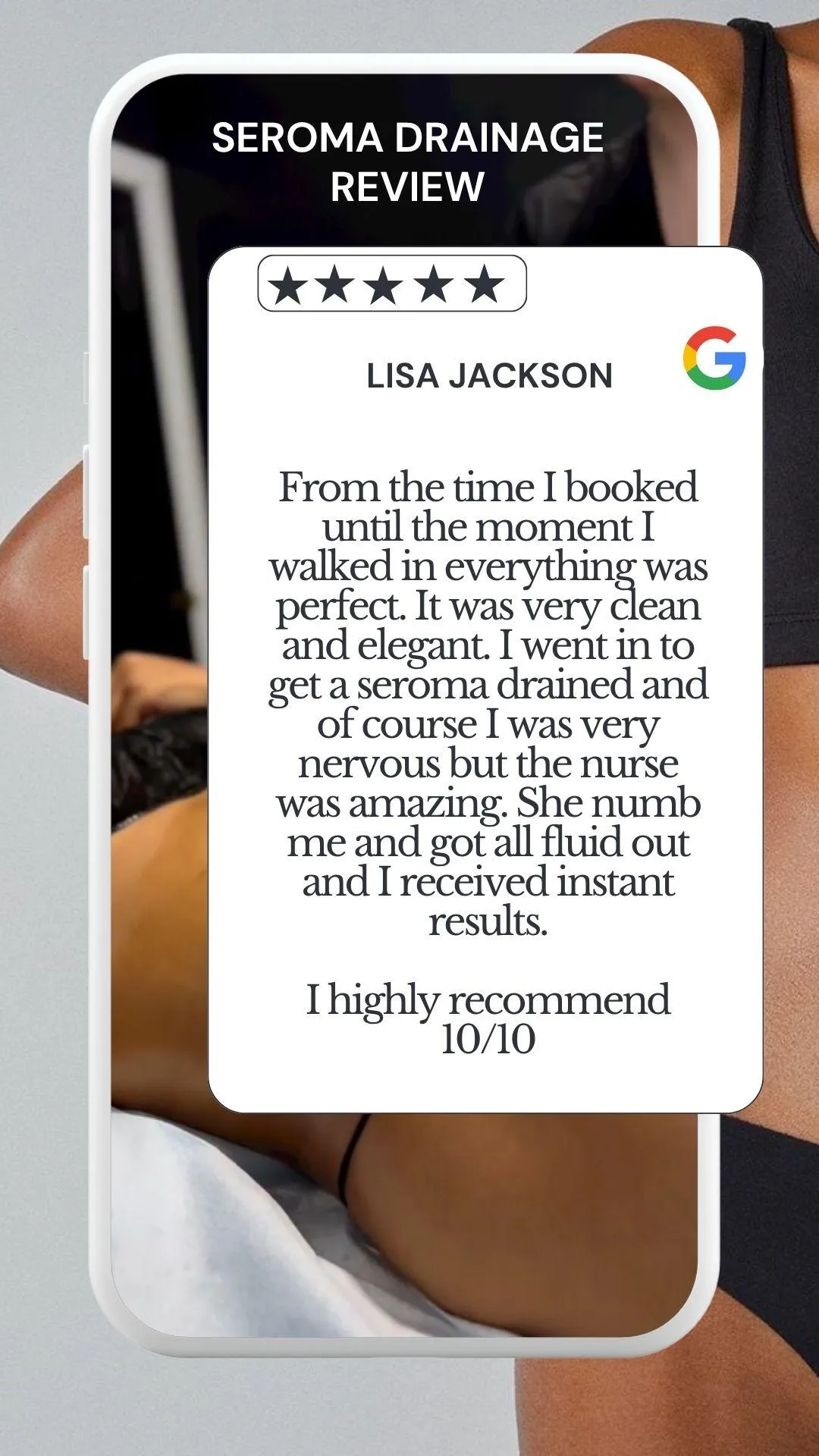 For confirmed seromas, this service drains fluid via needle aspiration. Slight discomfort may occur, but relief is usually quick and effective